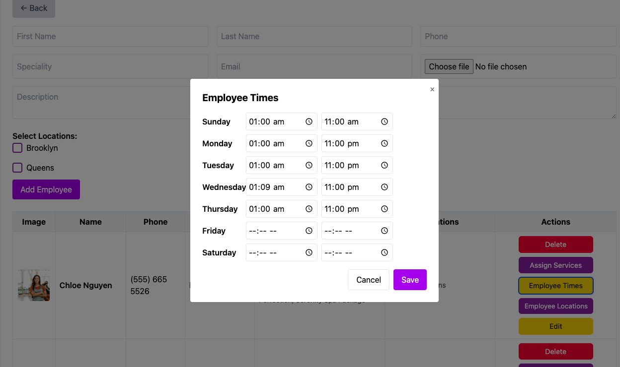 - From the employees row click "employee times" from the right side of the employees row